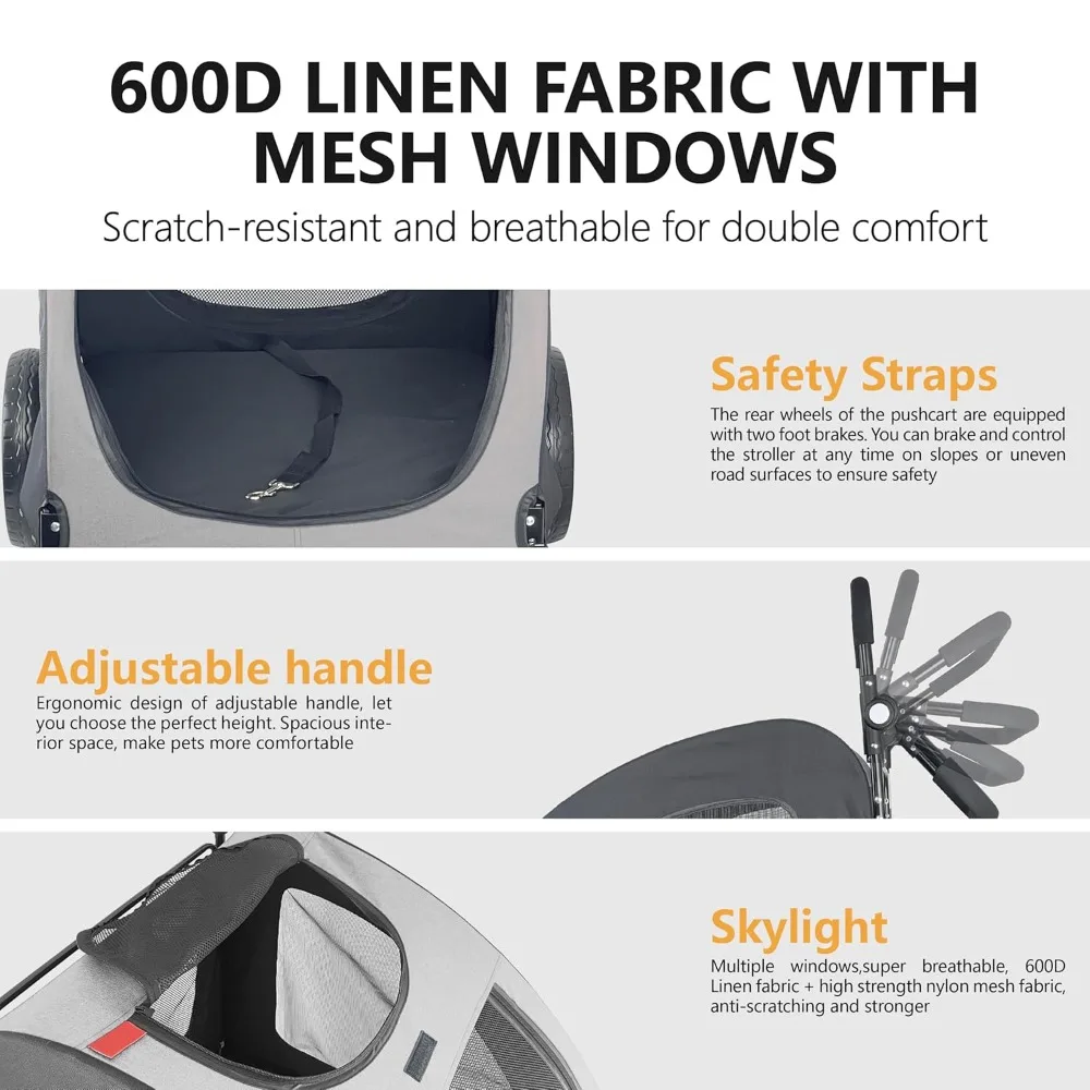 - 【Ventilated Comfort】The stroller features netted windows that provide optimal ventilation and protection for your pet, while still allowing them to see their surroundings. There is also a mesh screen window on top for your pet to peek out of. The stroller’s cloth is made of waterproof Linen material that is tightly sewn and has strong toughness, making it resistant to wrinkles