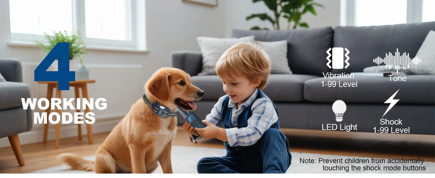 Includes Beep, Vibration (1–99 levels), Static Shock (1–99 levels), and LED Light. Easily customize intensity based on your dog’s behavior for safe, effective training.