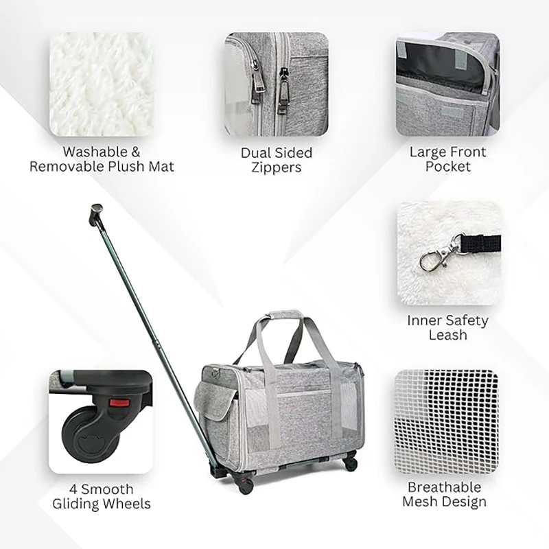 CONVENIENT MOBILITY: Our pet travel carrier features smooth-gliding wheels and a telescopic handle, allowing you to easily transport your pet through airports, train stations, or any travel destination. It minimizes the strain of carrying, making travel more comfortable for both you and your pet.